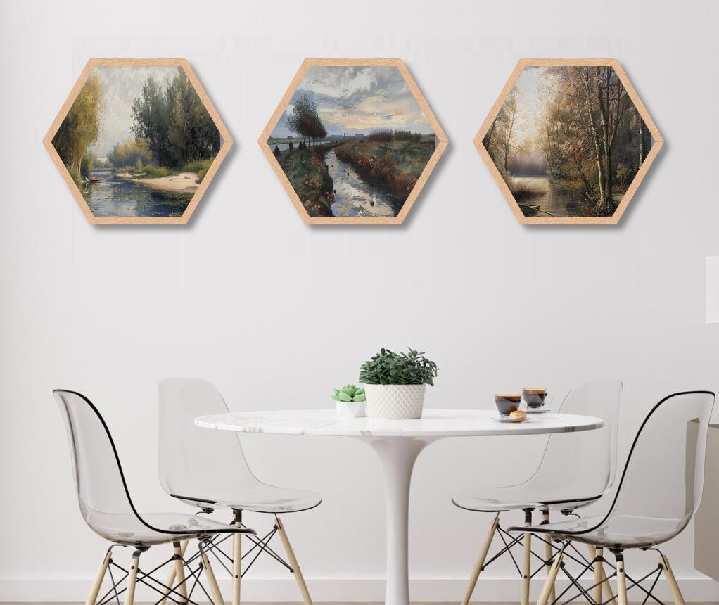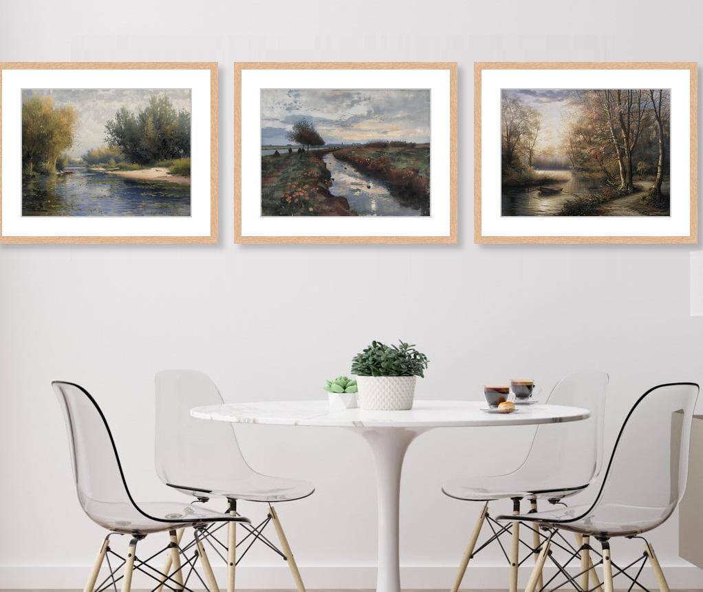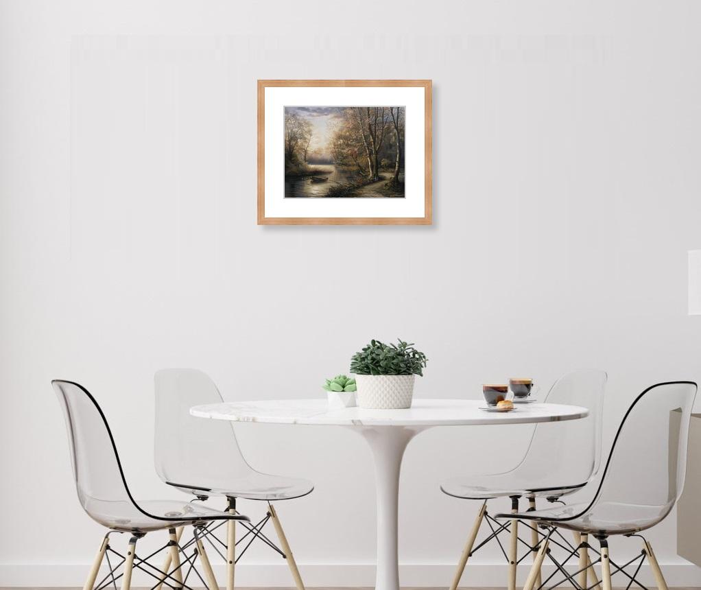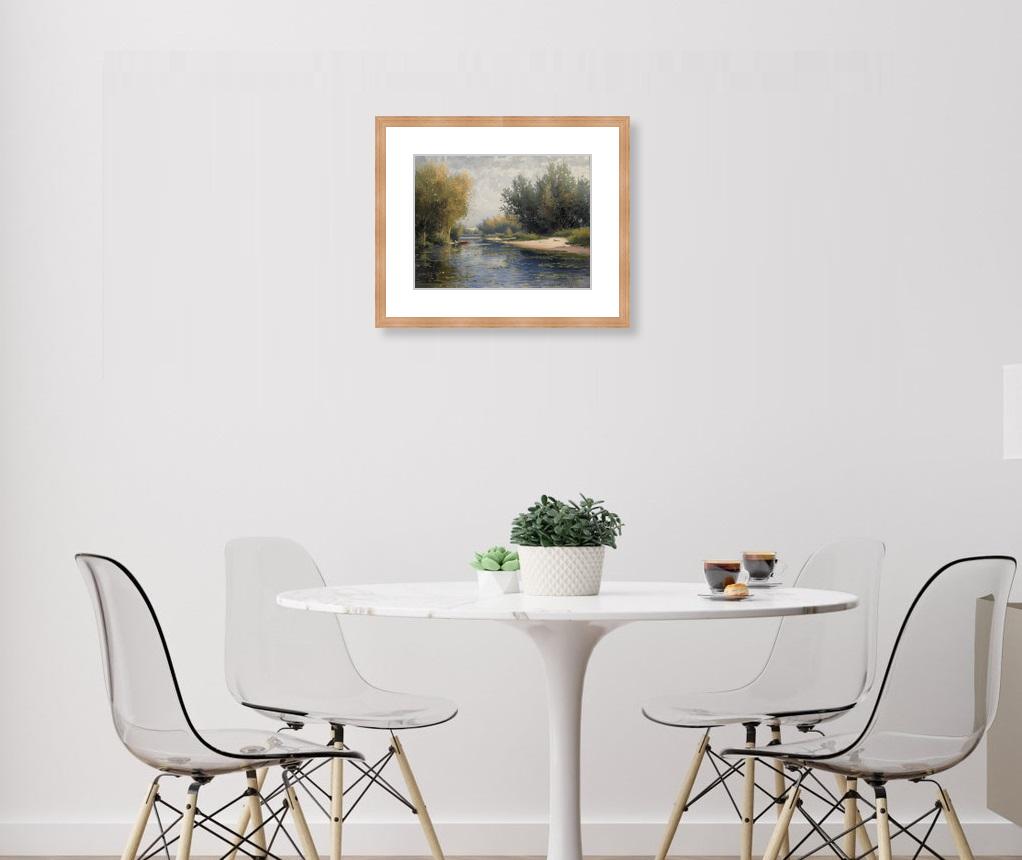 This gentle river scene captures a quiet moment in nature. Soft watercolor tones bring a calming feel to any space.