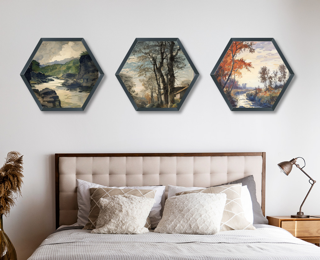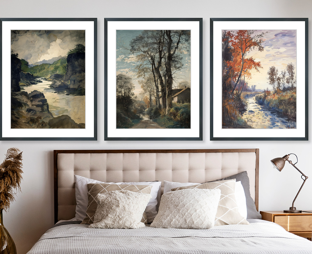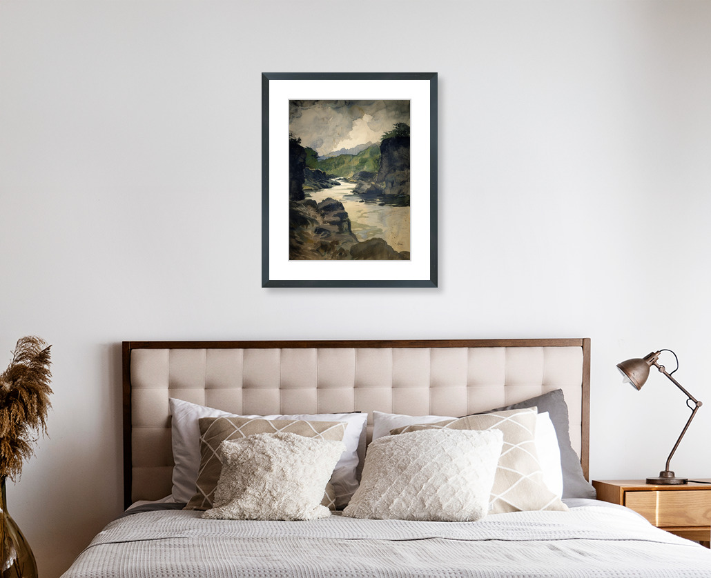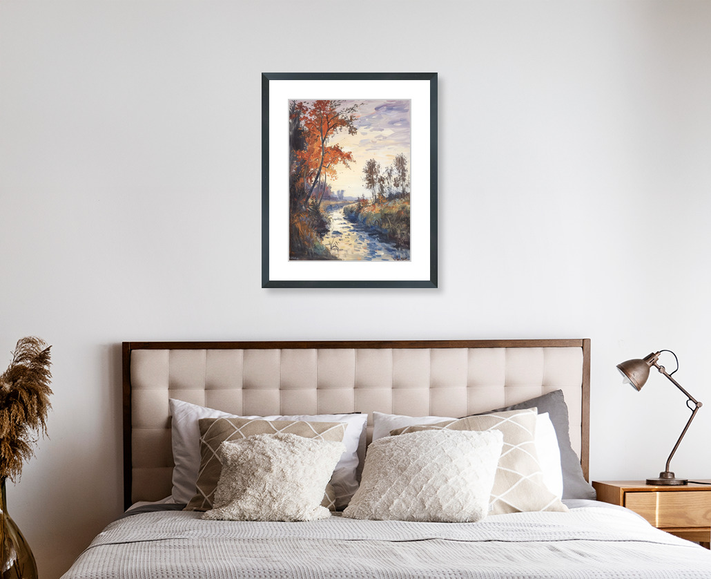 A calm stream with gentle foliage — looks great in grey frame with a light mount.