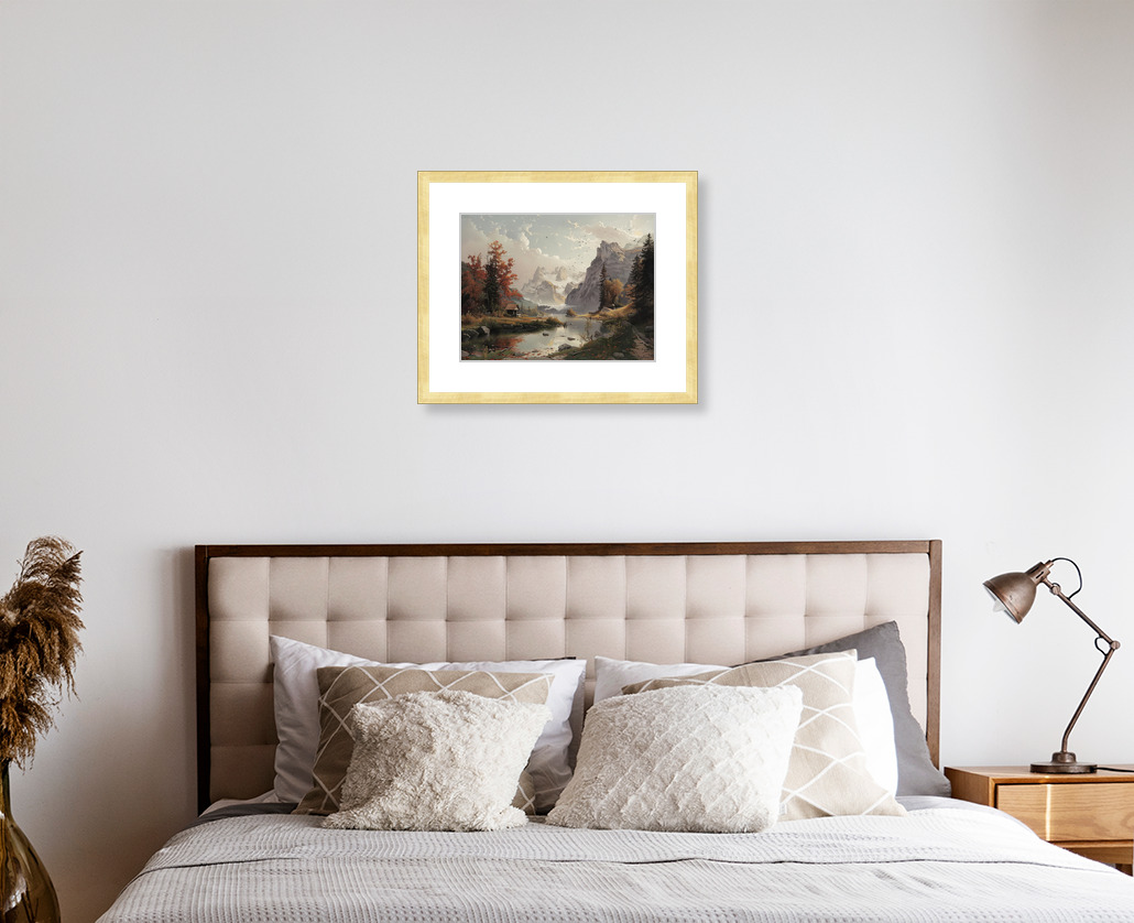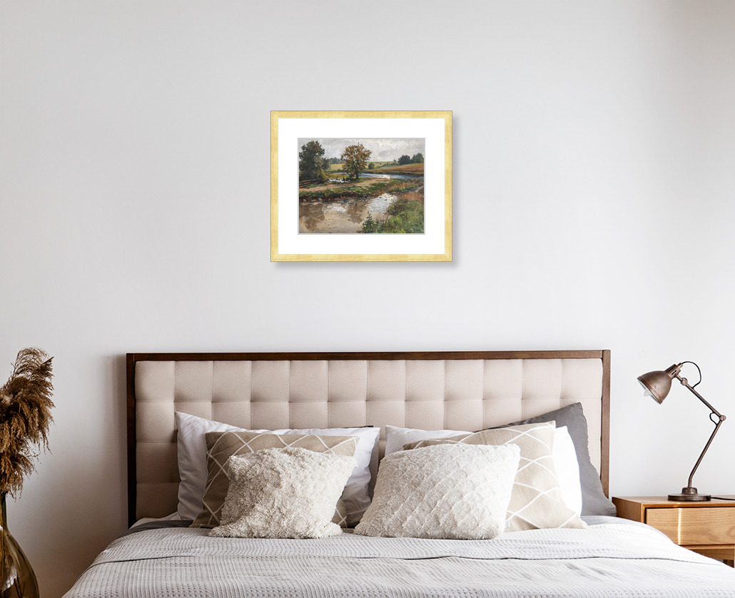 landscape artwork captures a peaceful countryside scene with a reflective river and lone tree, painted in a realistic, impressionist style.