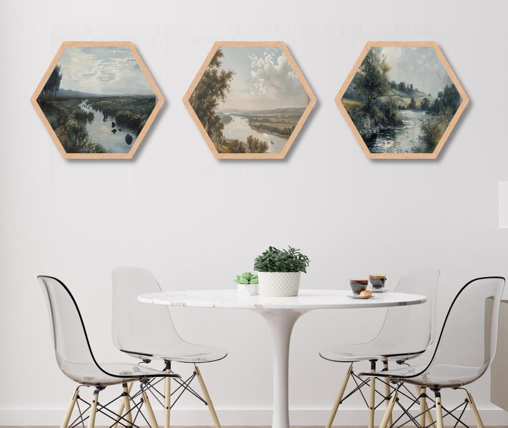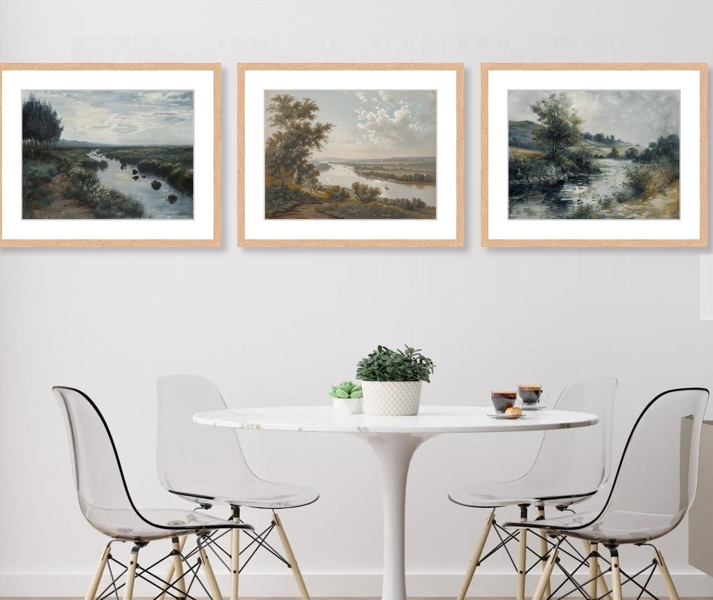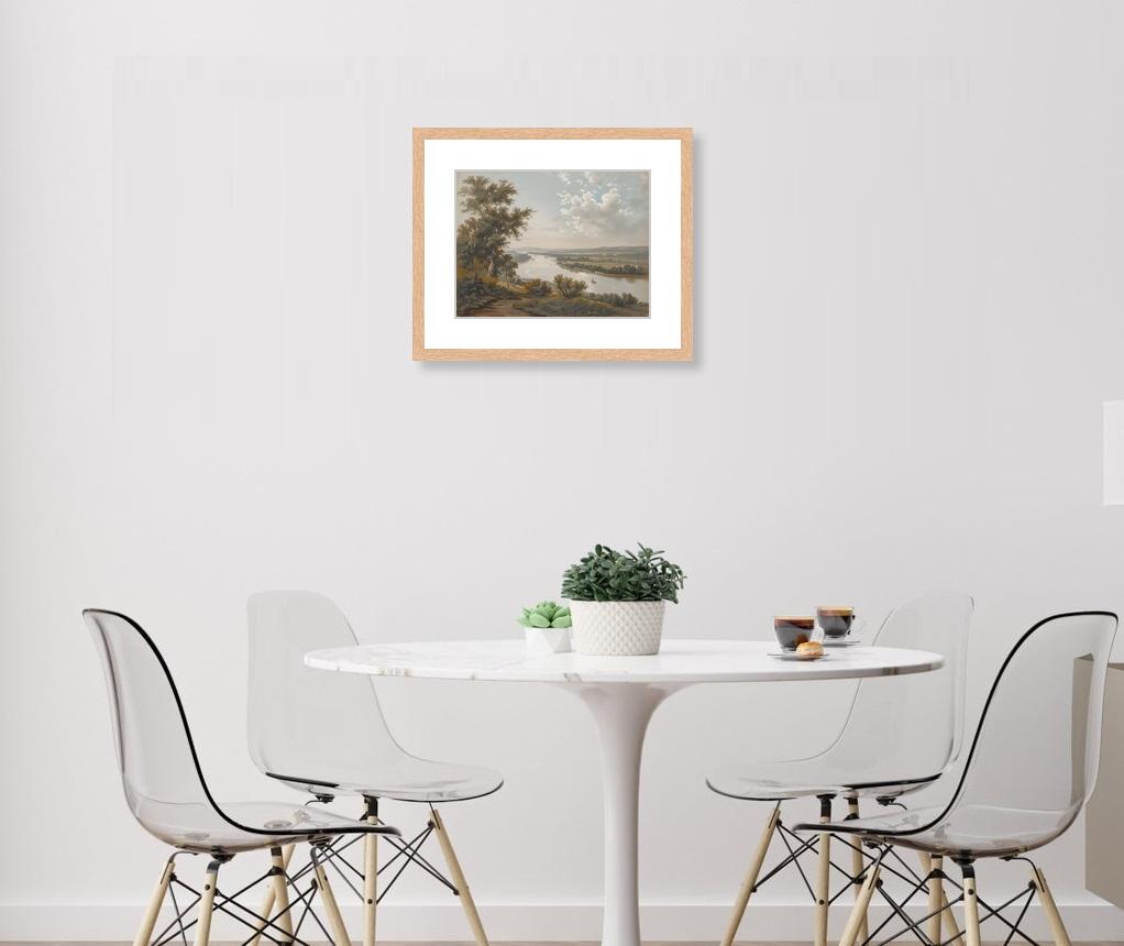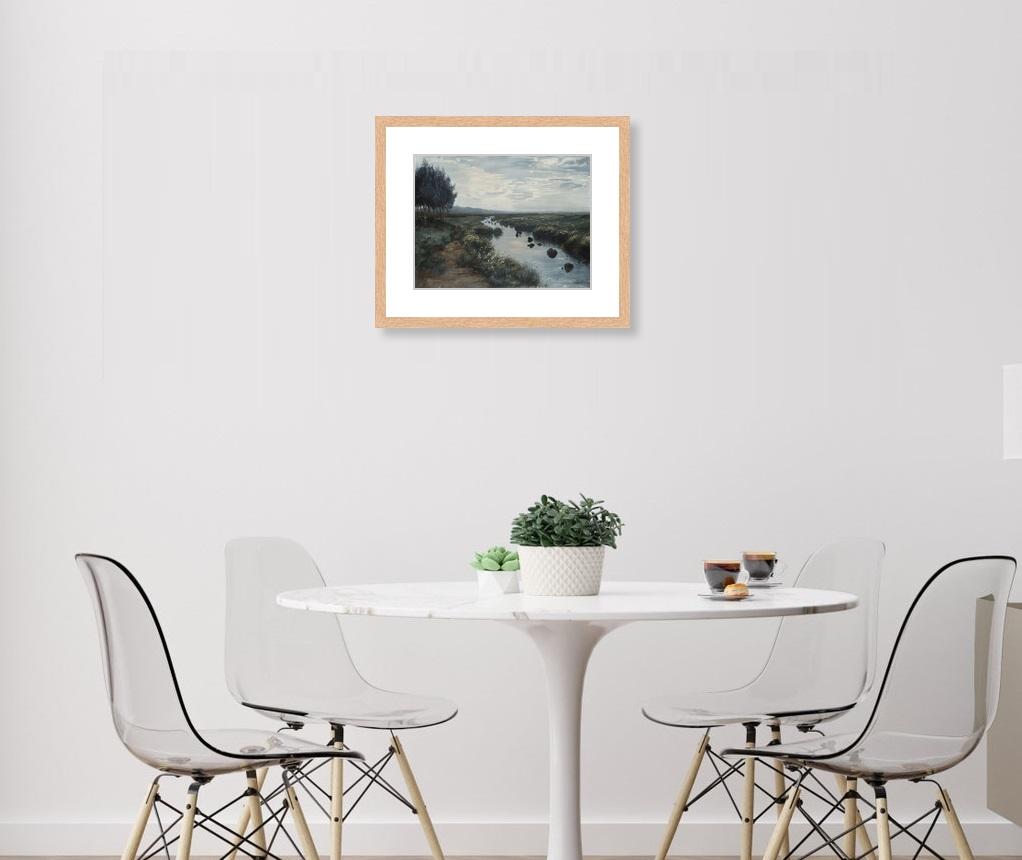 A gentle river flows through the countryside, surrounded by peaceful trees. This watercolor scene captures the calm beauty of nature.