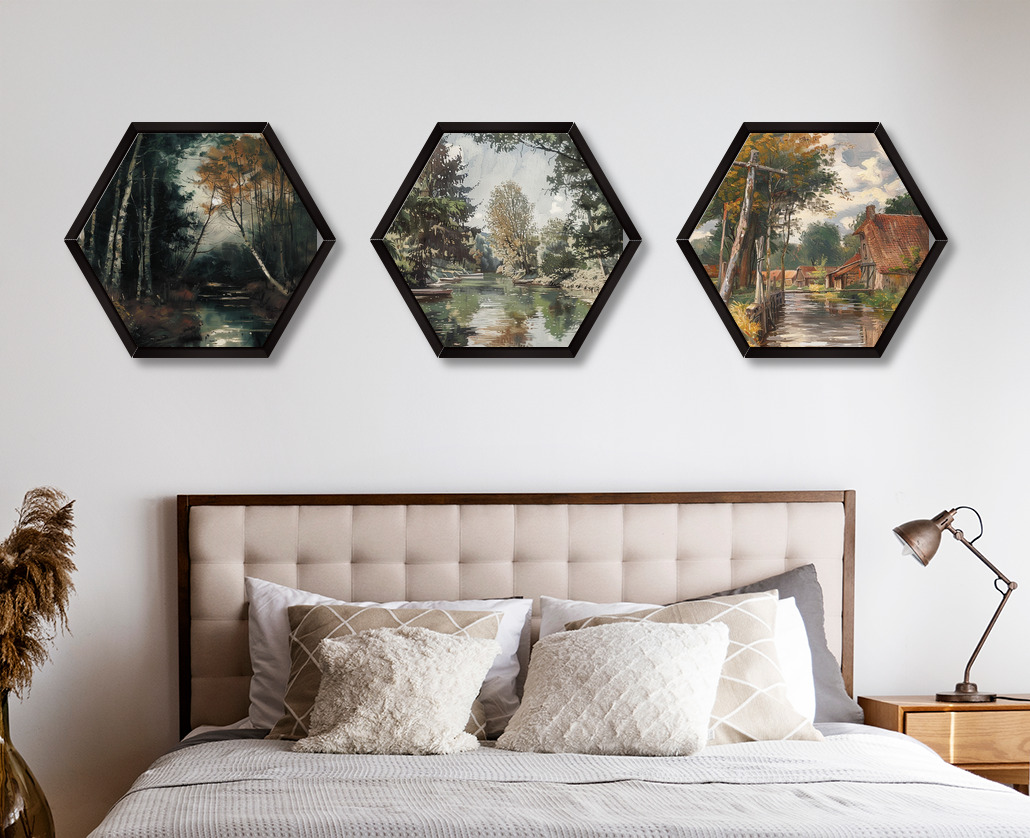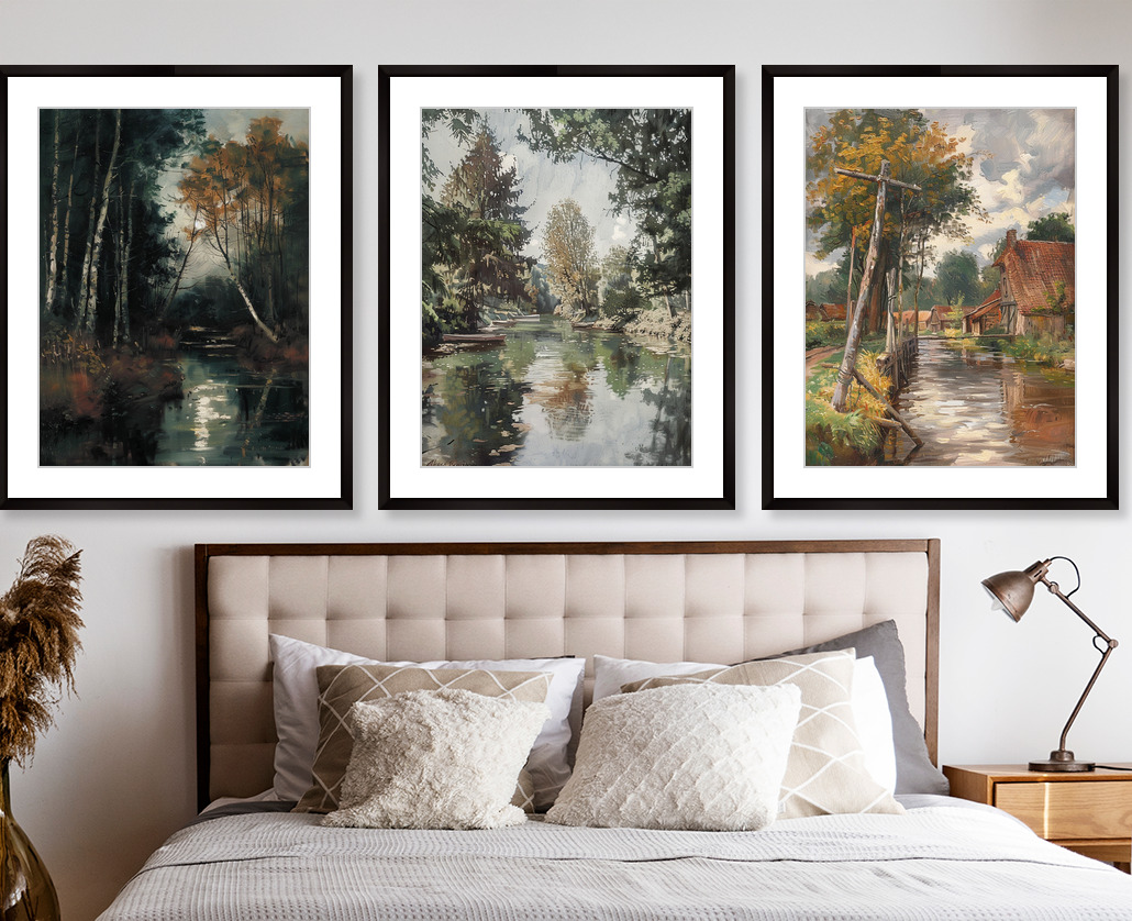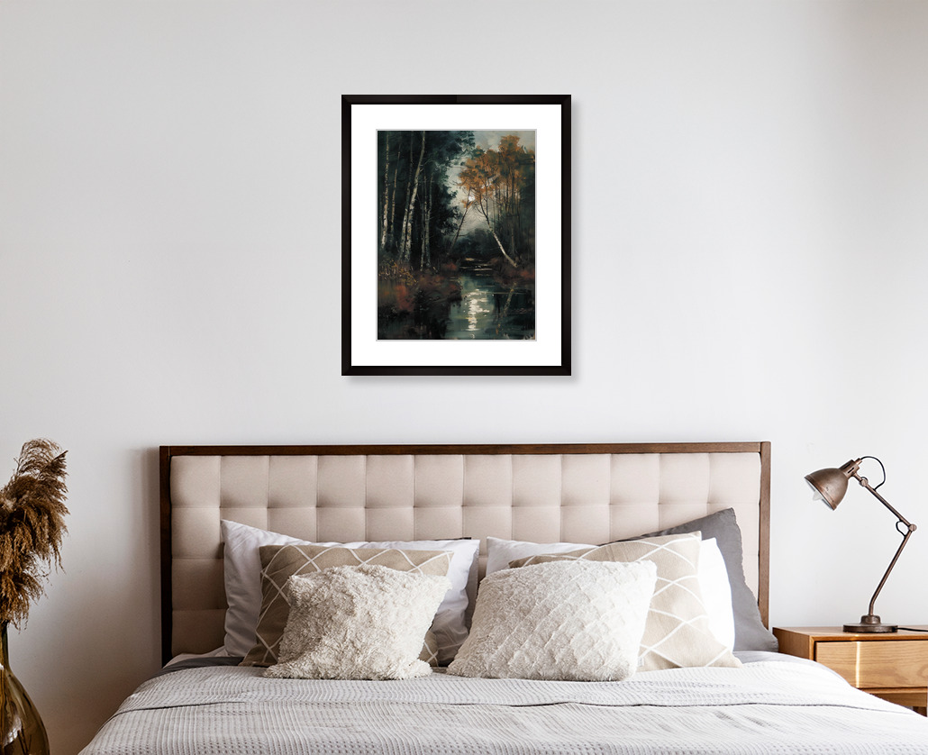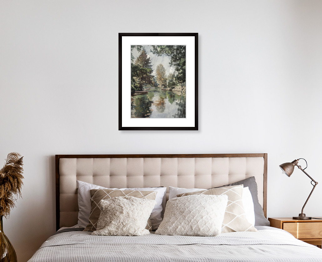 Peaceful trees mirrored in the river, available in white or silver frames.